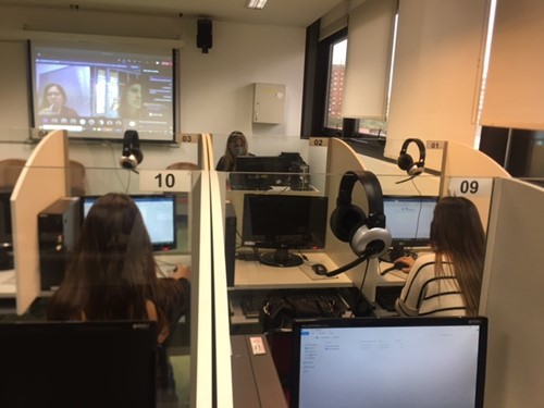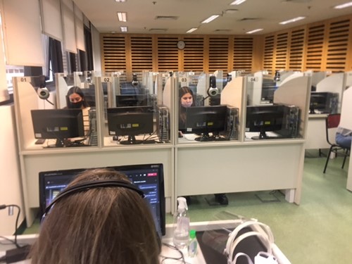 Cuenta con software para el perfeccionamiento de la pronunciación, para realizar prácticas en cabina de interpretación simultánea y con el software de memoria de traducción TRADOS, actualmente requerido en el ámbito laboral. También tiene proyector y televisor para distintas actividades como, por ejemplo, la traducción de material audiovisual.