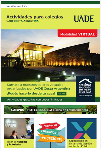 Para coordinar el dictado de talleres organizados por UADE Costa Argentina comunicarse a costa.argentina@uade.edu.ar.