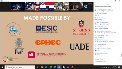 Se realizó de forma online la Ceremonia de Despedida del programa Doing Business in Latin America 2020. En su décima séptima edición recibimos a 79 alumnos de diferentes nacionalidades (Finlandia, Francia, Canadá, Holanda, el Reino Unido, Marruecos, Camerún y Gabón). Durante la reunión, Risto Korkia-Aho de JAMK University, Finlandia, destacó el trabajo conjunto de profesores, colaboradores y directivos así como las herramientas que les ha brindado el programa para el desarrollo de habilidades competitivas para el futuro de los estudiantes. También estuvieron presentes Florencia Sciarrotta, directora académica del programa, y Paula Iglesias por UADE Internacional. ¡Gracias a cada alumno por participar!
