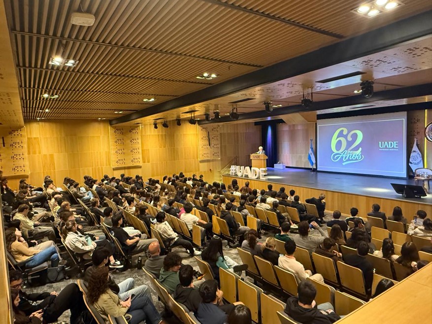 Aula magna llena de estudiantes para escuchar la charla del periodista sobre su historia en el ámbito futbolístico, periodístico y educativo.
