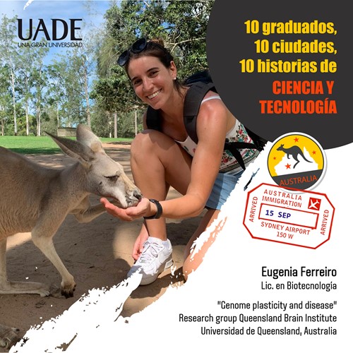 Te presentamos a Eugenia, Lic. en Biotecnología de la UADE (2017). Realizó su tesis de grado en el Instituto de Investigaciones Biomédicas en Facultad de Medicina UBA-CONICET. En 2019 se fue a vivir a Australia y desde enero de este año trabaja en el Queensland Brain Institute, dentro de la Universidad de Queensland, como miembro del grupo "Genome plasticity and disease". A partir del 1° de julio comienza oficialmente su PhD. Trabajará en el estudio de factores genéticos y epigenéticos en enfermedades neurodegenerativas.